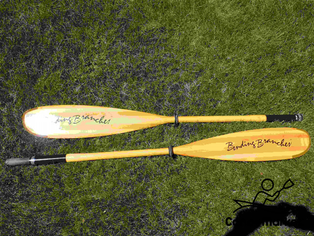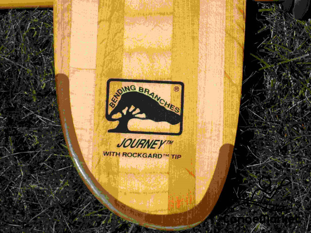 Bending Branches Journey performance touring kayak paddle. Long, narrow asymmetrical scooped blade (5 ½" x 23") for minimal wind resistance and plenty of surface area. Length is 240 cm. Butternut, cherry and basswood laminated blade with Rockguard tip to protect the blade. Strong, tight fiberglass composite ferrule with stainless steel clip and feathering adjustment for left or right hand dominate paddlers will not corrode. This paddle has always been stored vertically and is in excellent condition. No dings, delamination or splits.