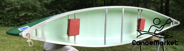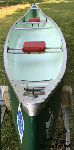 It has the original Blue Hole Seats that have been lowered about 4 inches with an extra pad added that can be removed if you want. It has original Blue Hole Sunbright Tennessee decals as well as a few custom decals that you can see in the photos. This is a true one of a kind canoe! True Barn find just in time for the Buffalo River to open up! This canoe will get lots of attention on the rivers in the southeastern United States! It has the dark forest green exterior with the light sea-foam green interior, very attractive setup!