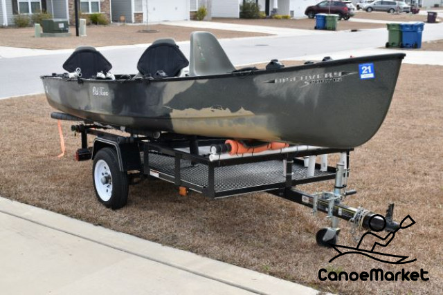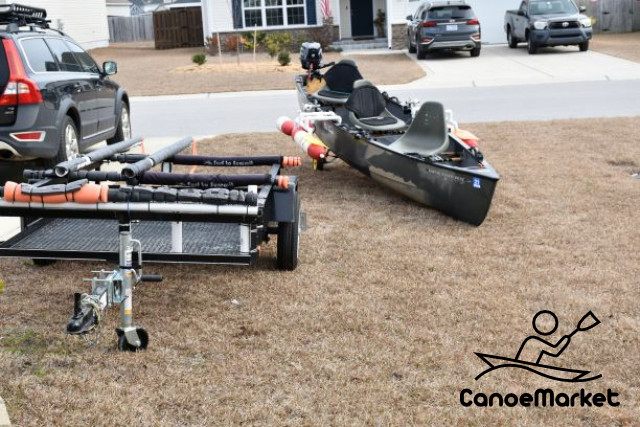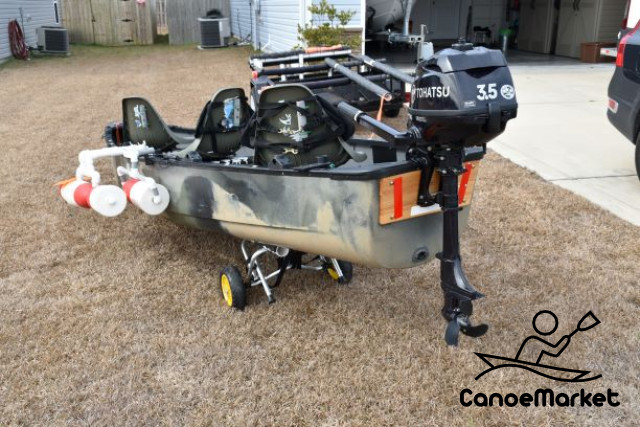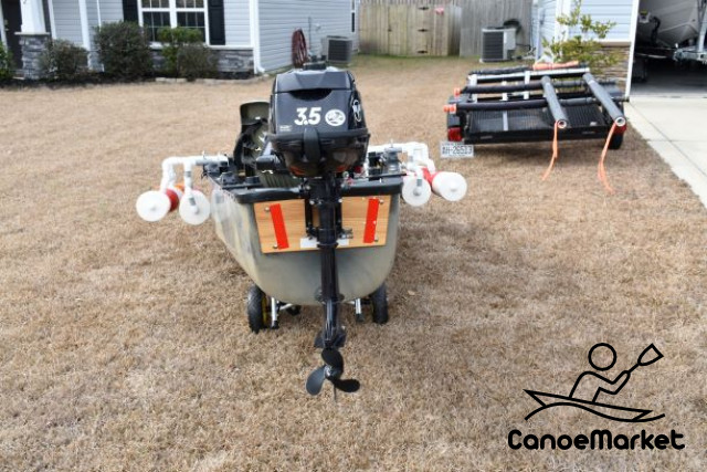 A fantastic combination of a rigged out canoe, motor, and a trailer. This combo can go to places that no boat can: is can easily handle the intracoastal waterway while drafting at 4 inches of water. It is also slim enough to fit into the narrowest of creeks and rivers. You can paddle your way or just use the motor to get fast to your favorite fishing spots.