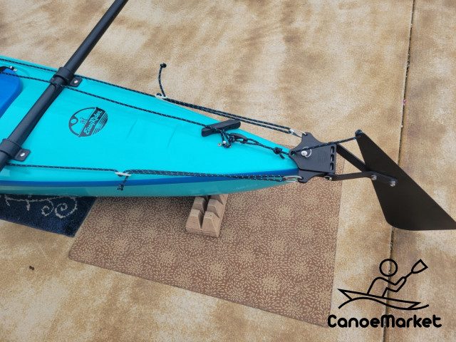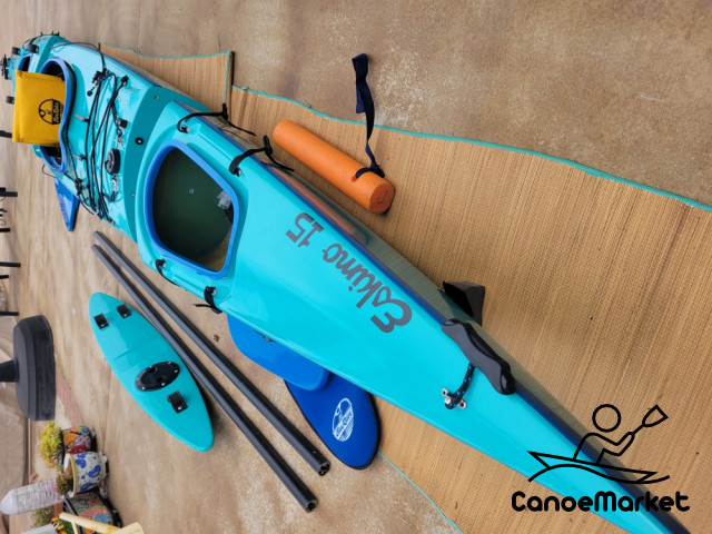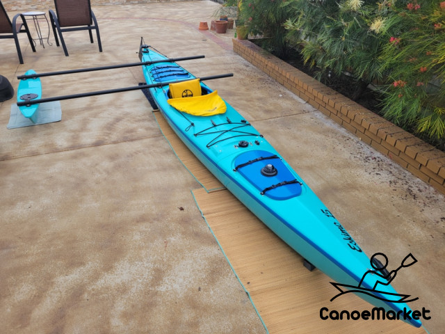 While built in 2005 this kayak has seen less than a dozen water adventures and has been sheltered otherwise. It is in very good condition with no leaks and only a few cosmetic scratches and edge chips. Included are: a set of travel bags for each section, a 4.5’ outrigger with two 7” poles, a rudder controlled with adjustable foot pedals, and a spray guard for the cockpit.