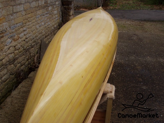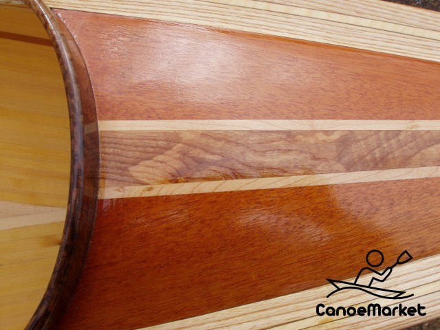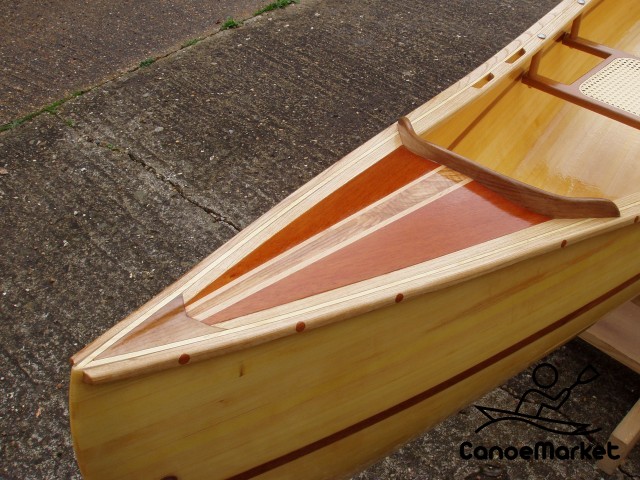 This particular example is made to the Peterborough Pattern using our staple-less construction which shows off the wood to its best without staple holes showing. She has decks made from reclaimed mahogany with a centrepiece of figured olive ash and maple stripes either side. The gunwales are made from tough springy ash and the apex of each deck is finished with a piece of American black walnut. This lovely dark timber is also used to fine effect on the laminations of the coaming. The seats frames are made from elm and the supporting pillars are turned from oak and hung on stainless steel bolts.