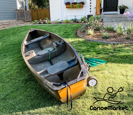 15 ft long 3 ft 7 inch wide canoe with square transom that can support up to 4 hp outboard motor. Comfortably fits 4 people, stable enough to fish standing, and currently being transported on roof rack of our car. Price includes two oars and dolly. Good condition