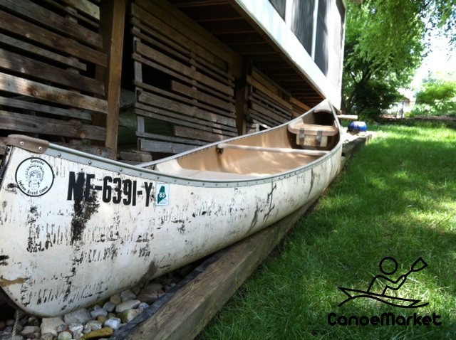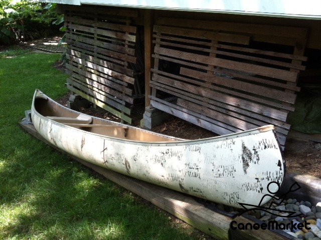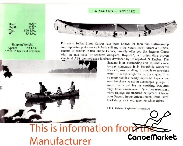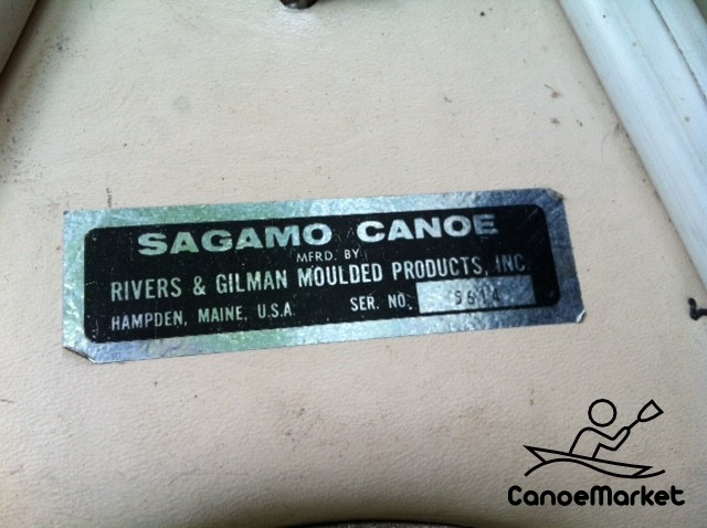 Indian Brand Sagamo Canoe with Birch Bark markings, 16' squaw, 65lbs. from Maine with original serial number. Made by Rivers and Gilman.