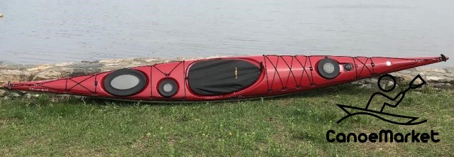 Red Deck, White Hull, LOA 17’, Beam 22”, Weight 56 lbs, Capacity 325 lbs, drop skeg, 3 hatches, deck line, deck compass. This is a very good LI Sound solo sea kayak. Stable enough for the waves, yet I can reliably Eskimo roll when I want to cool off. New, it cost us a bit over $3,000. It is missing one letter on the logo.