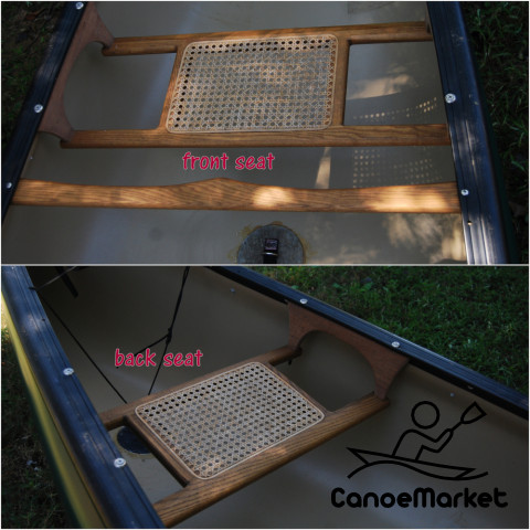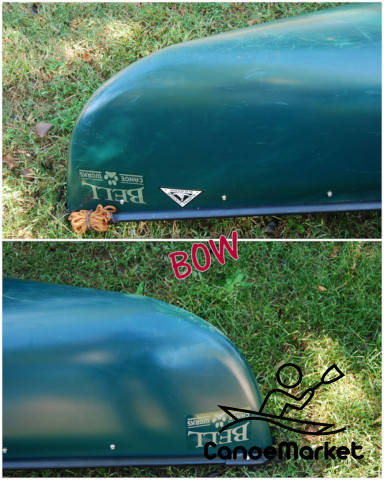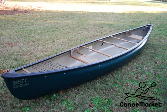 Canoe is in very good condition in my opinion. Only used a dozen times. It has the typical scratches on hull with a couple of larger scratches (see pictures). Has a Vin # plate attached to side of hull. This canoe is classified as a down river canoe although it works just fine on flat water. It tracks well and turns wonderfully because of the bow and stern rocker. Canoe is hunter green with black plastic gunwales. Seats are made of Ash and Walnut with cane mesh. Seats are slightly angled down for kneeling position if desired but also comfortable if just sitting. Wooden handles at bow and stern. Wooden portage thwart. /